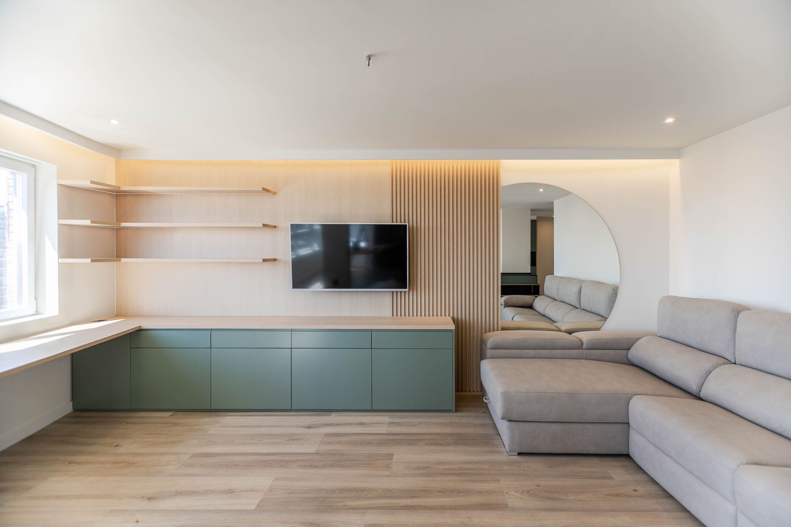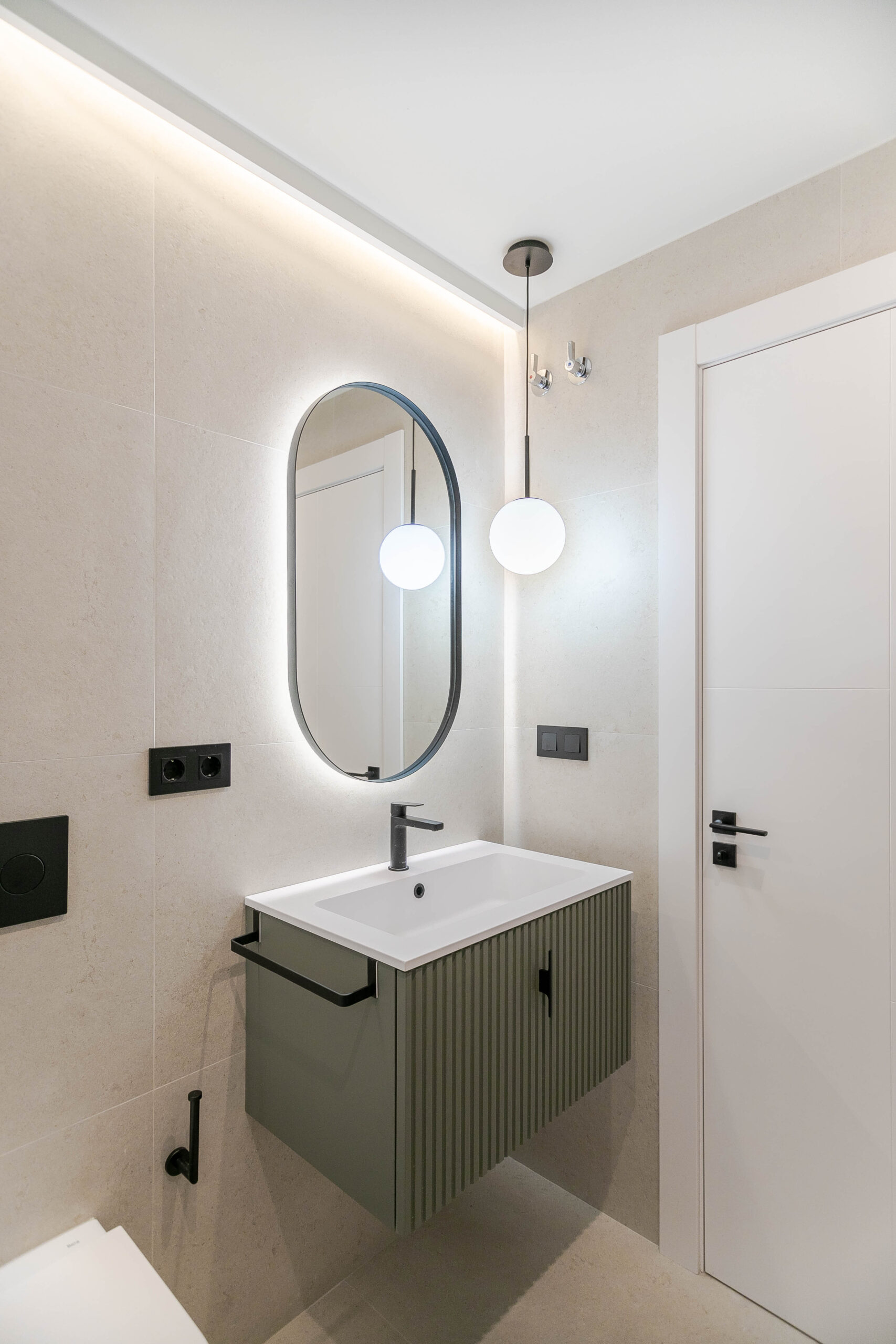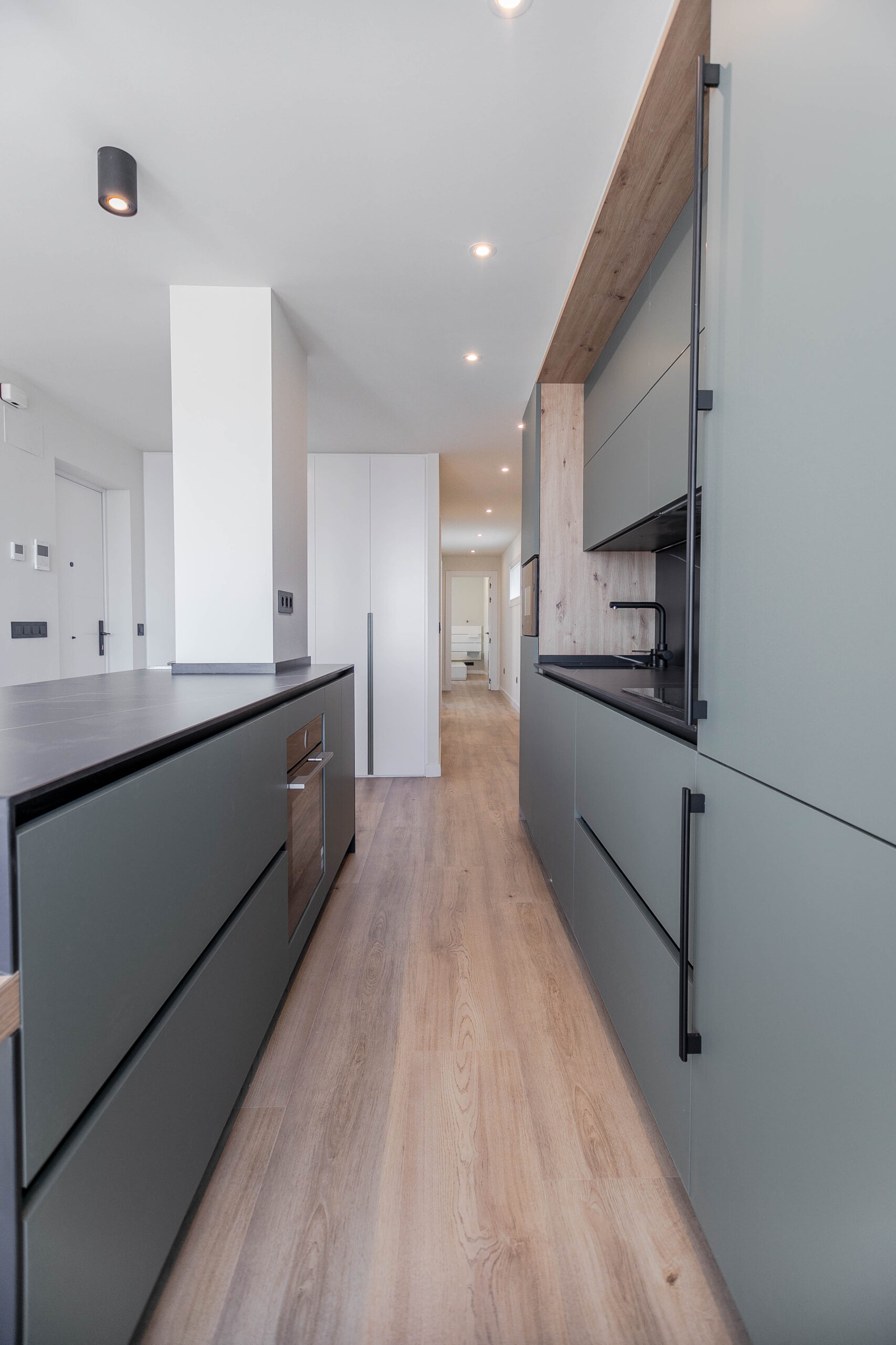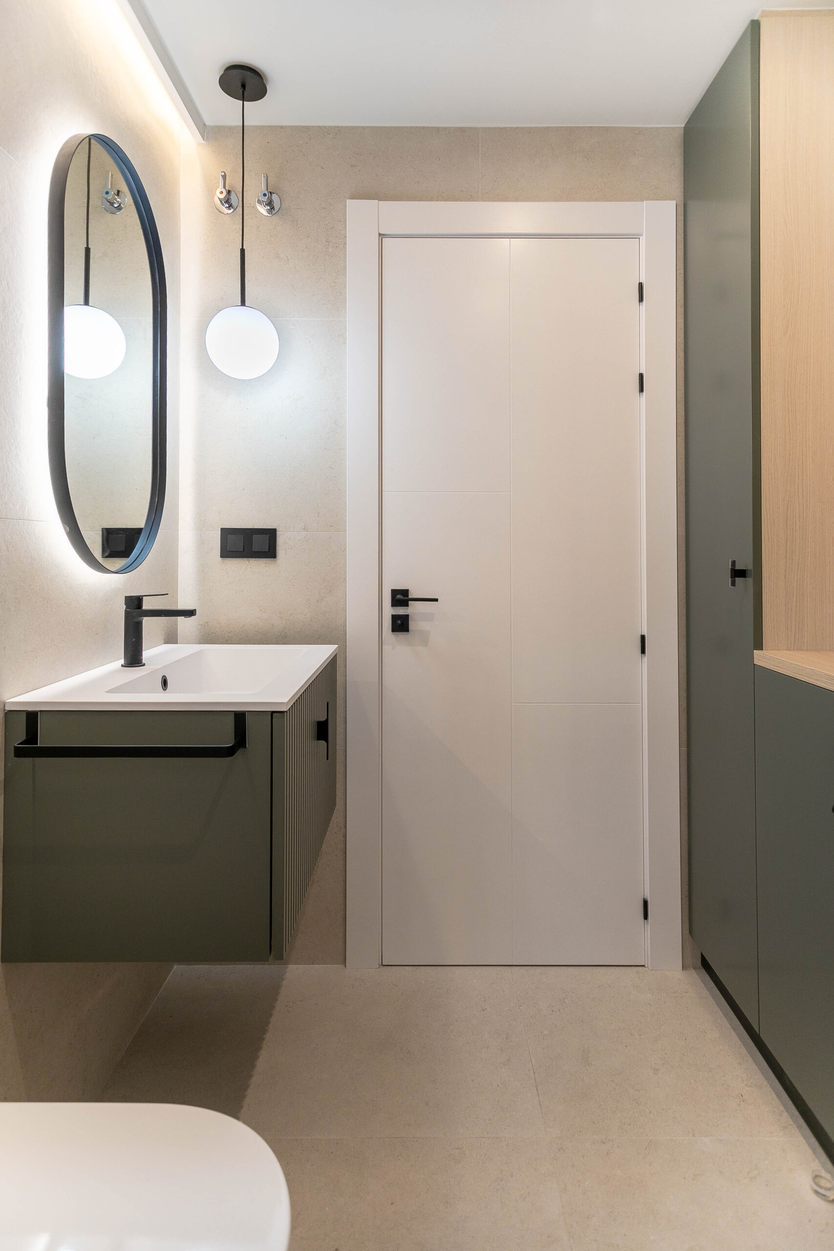 Todo el mobiliario ha sido diseñado y fabricado a medida, siguiendo una paleta de colores cálidos, combinada con tonos verdes y la madera del pavimento. Estos elementos se complementan con detalles en negro mate, presentes en tiradores, espejos y herrajes, aportando contraste y carácter al conjunto.