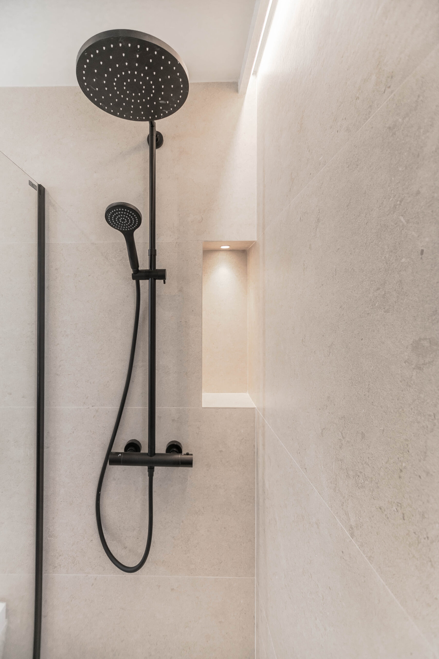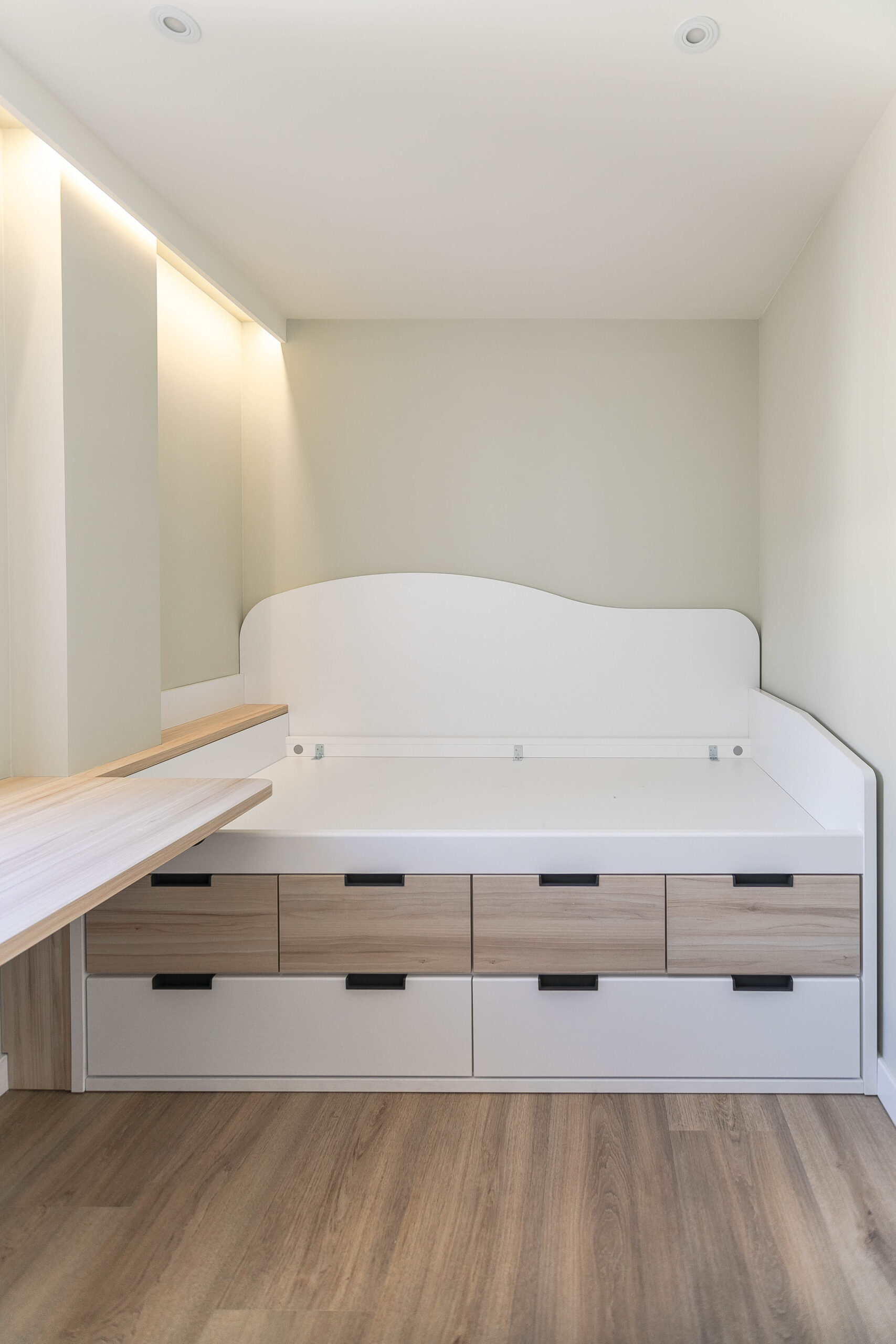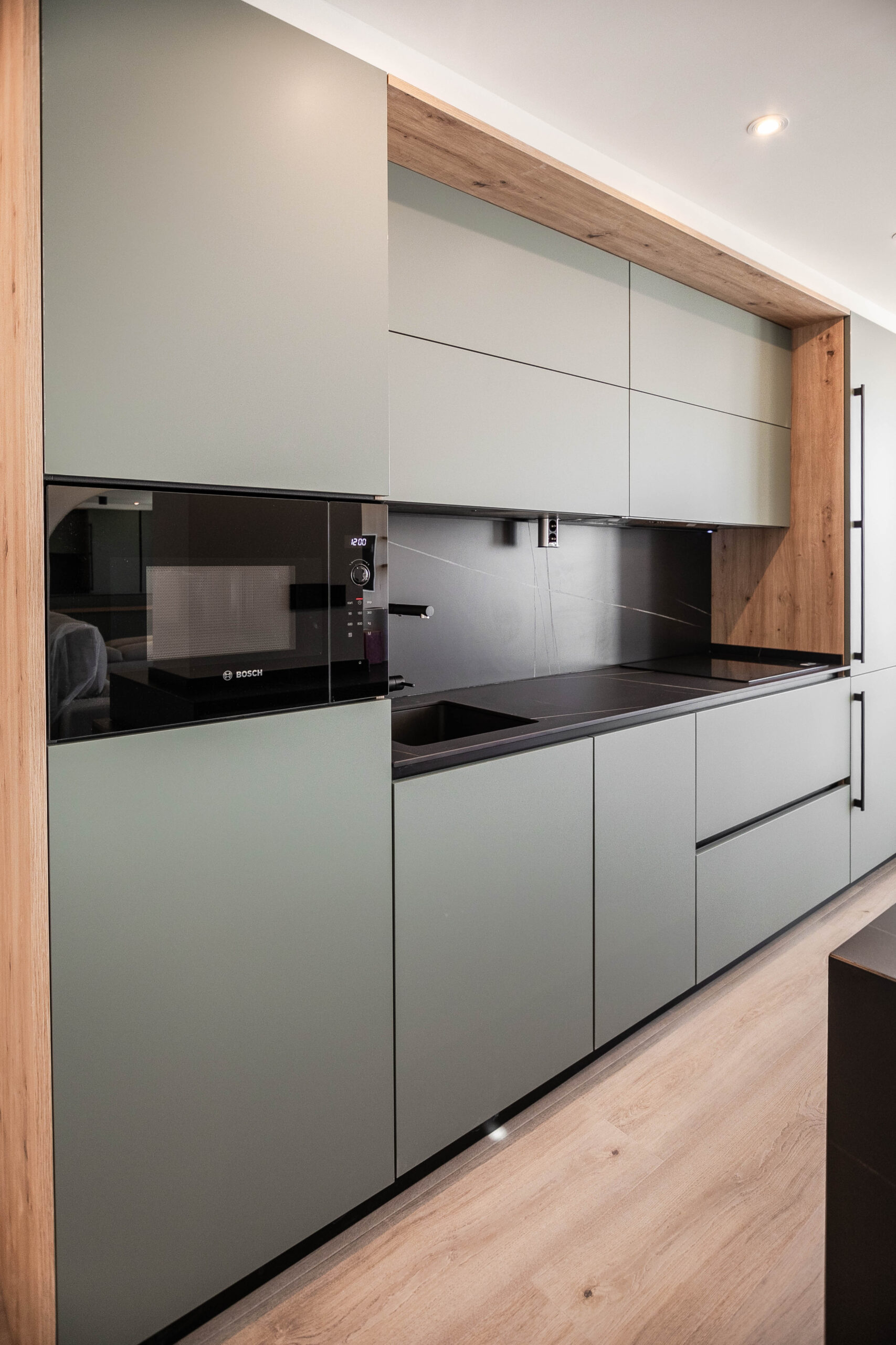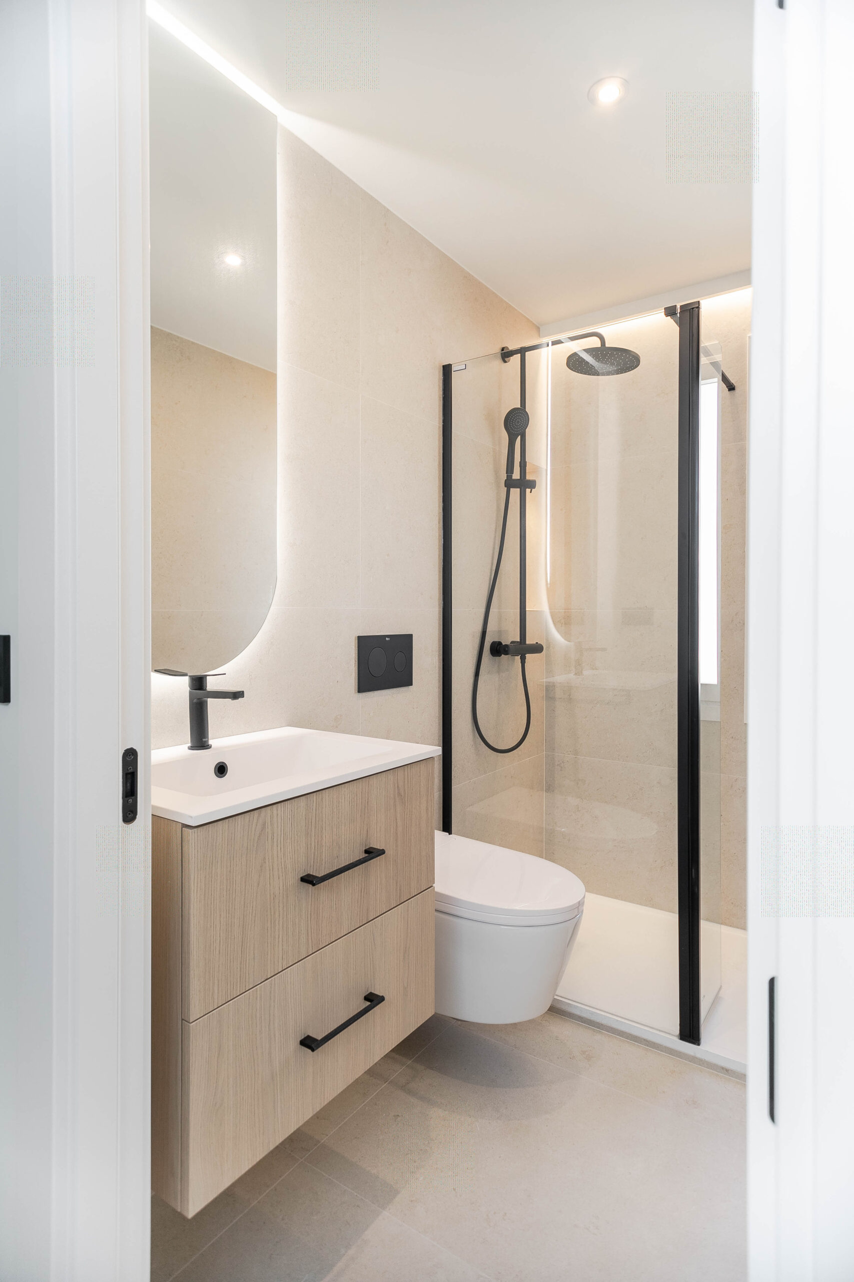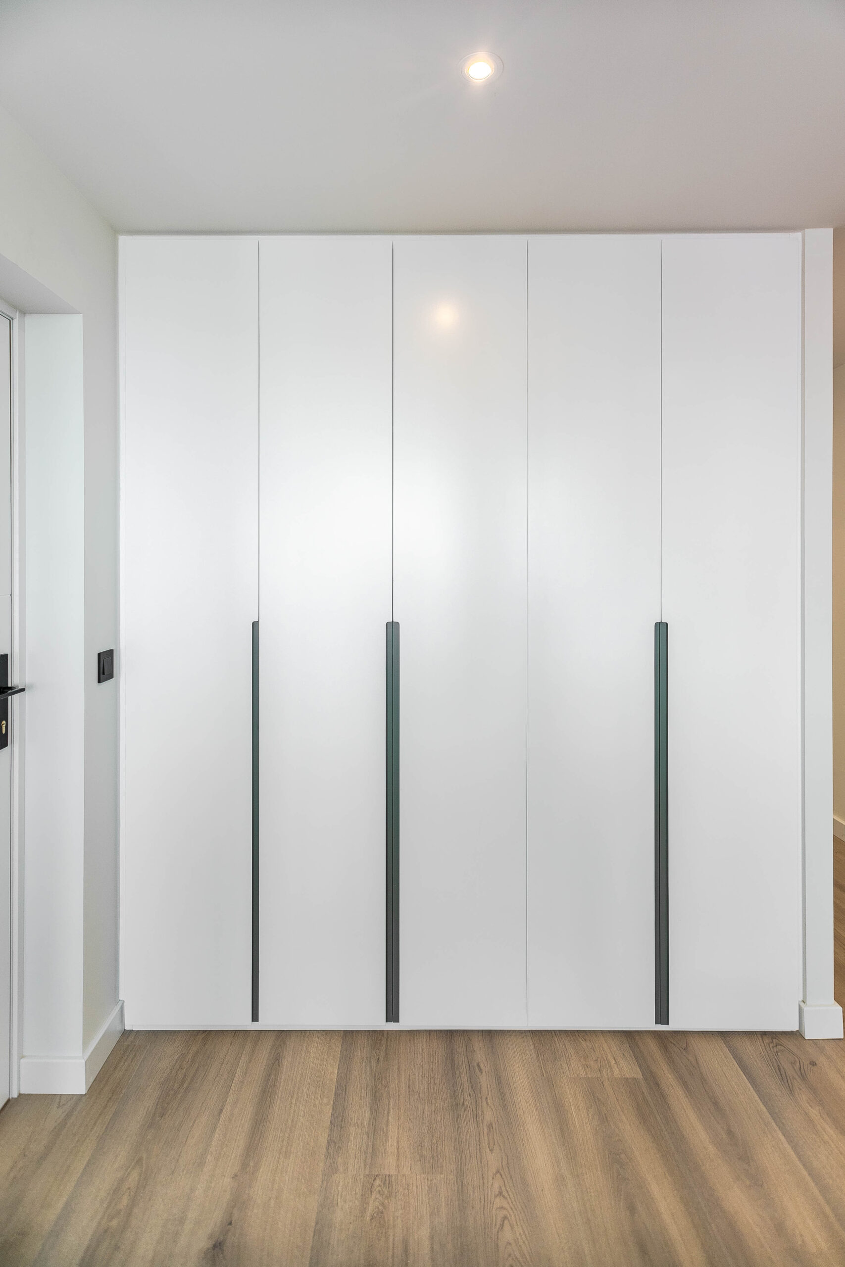 Todo el mobiliario ha sido diseñado y fabricado a medida, siguiendo una paleta de colores cálidos, combinada con tonos verdes y la madera del pavimento. Estos elementos se complementan con detalles en negro mate, presentes en tiradores, espejos y herrajes, aportando contraste y carácter al conjunto.
