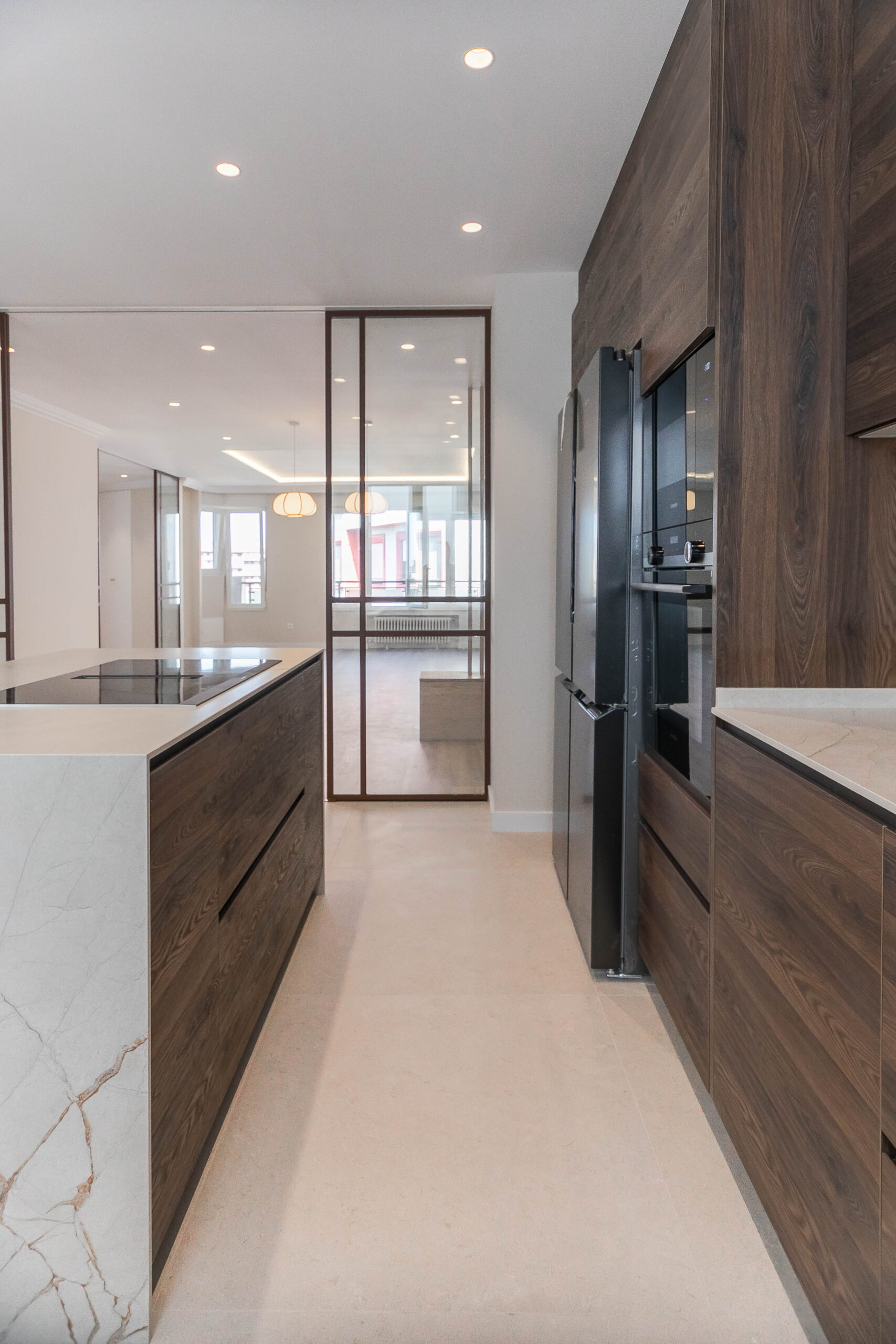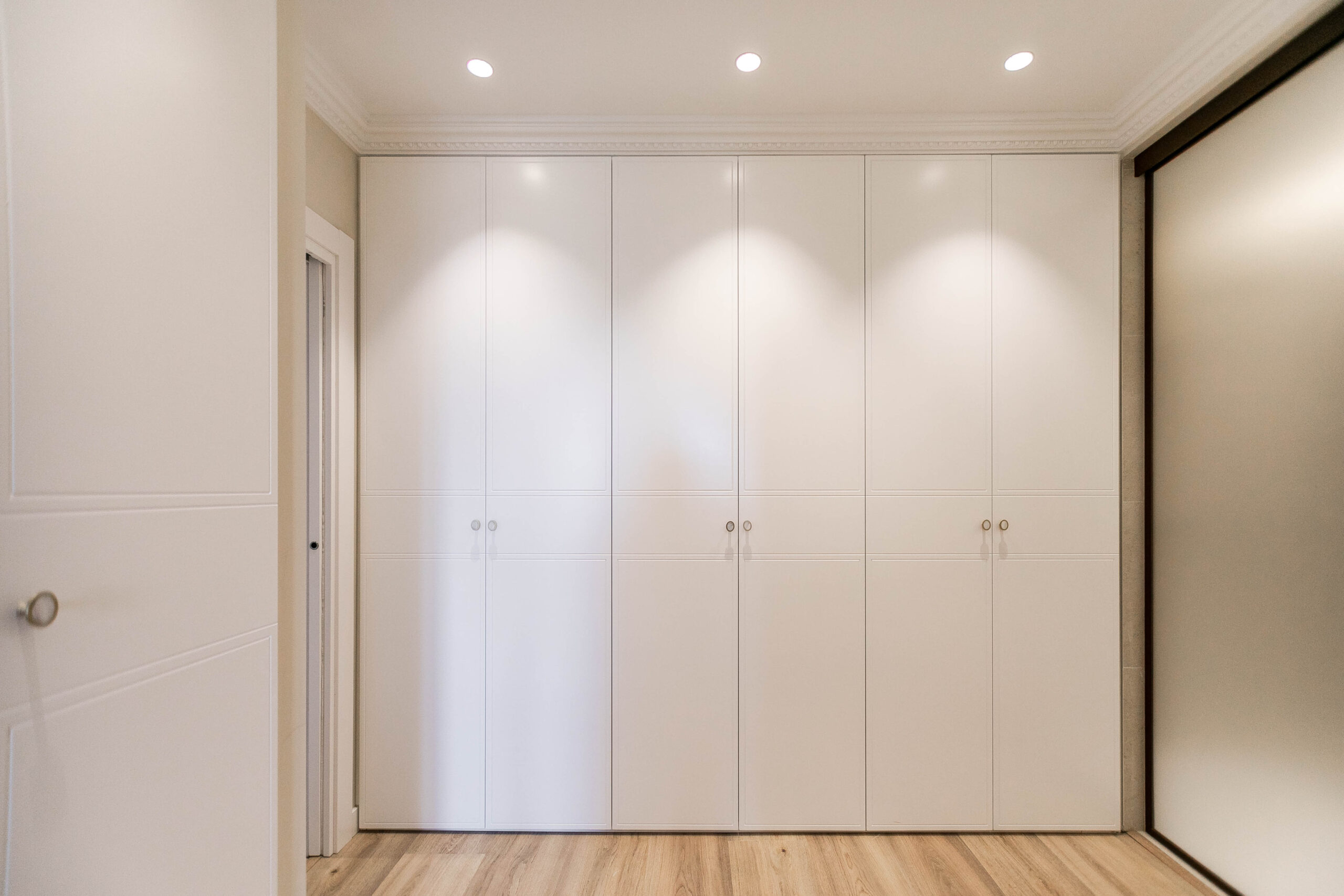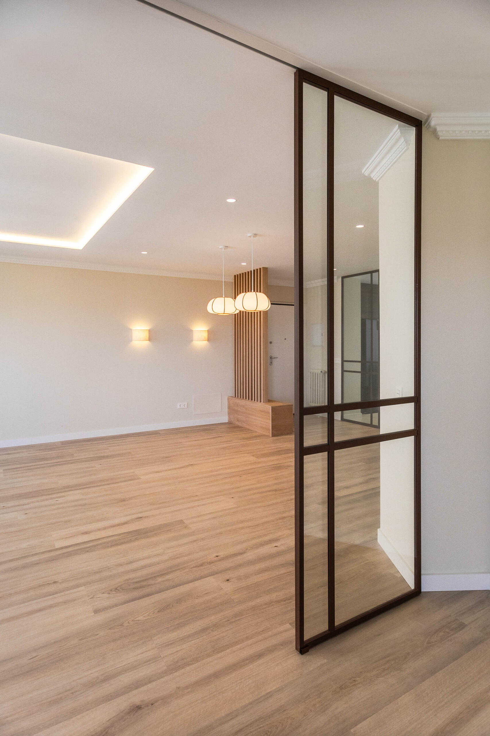 Los armarios empotrados han sido diseñados a medida, al igual que el resto de la carpintería interior, siguiendo una estética uniforme y cuidada. También se incorporaron cerramientos y divisiones mediante carpinterías acristaladas, que permiten separar espacios manteniendo la entrada de luz natural y la sensación de amplitud.