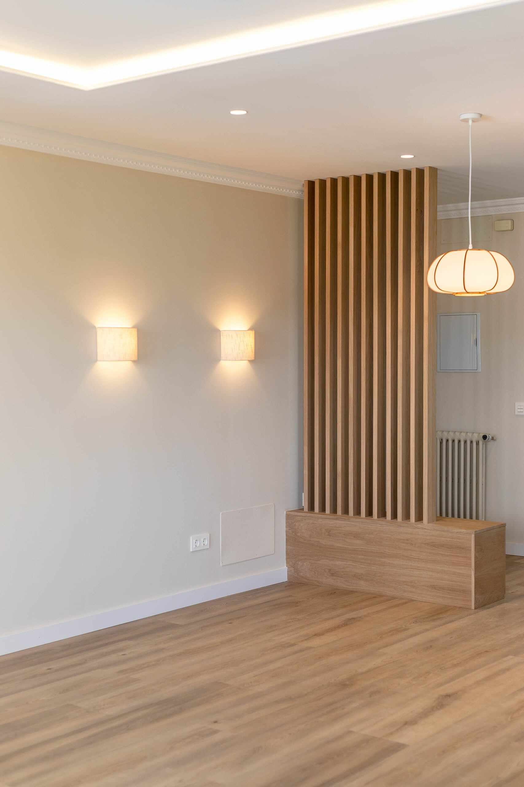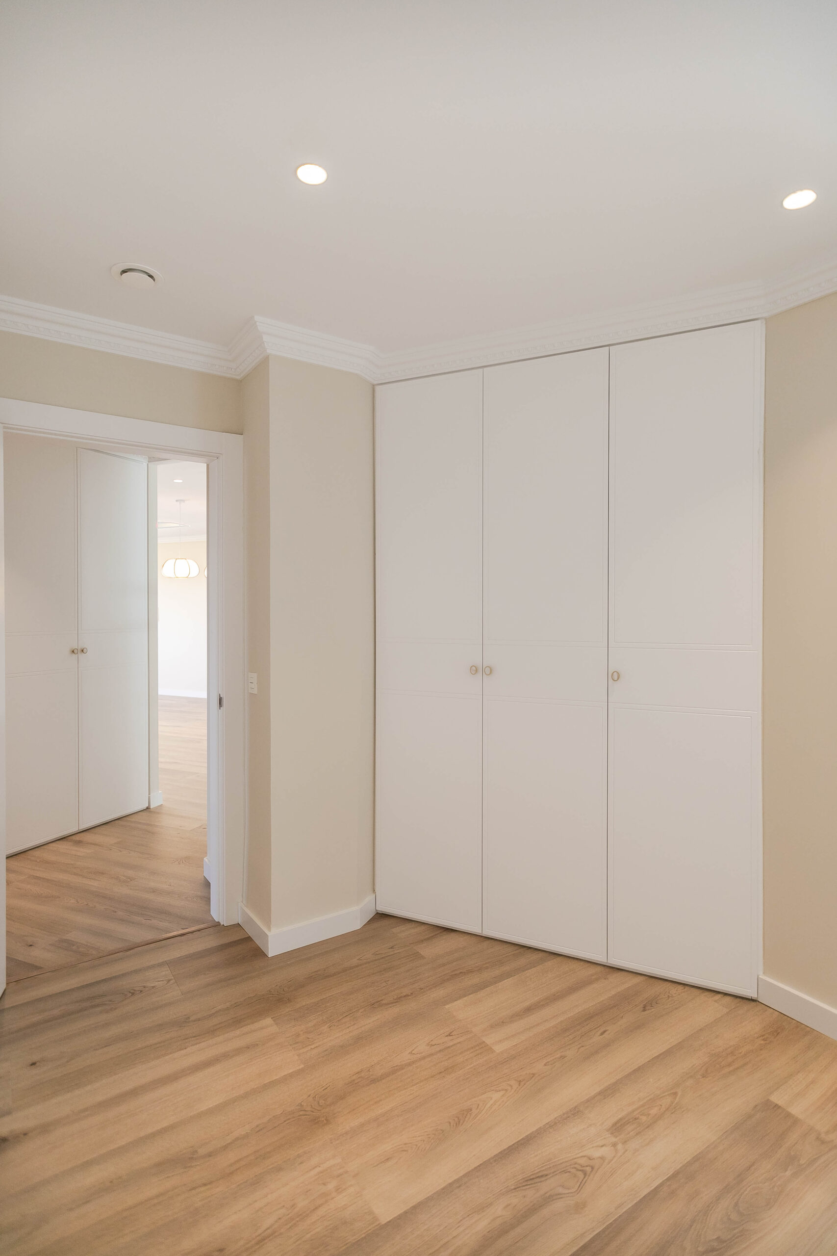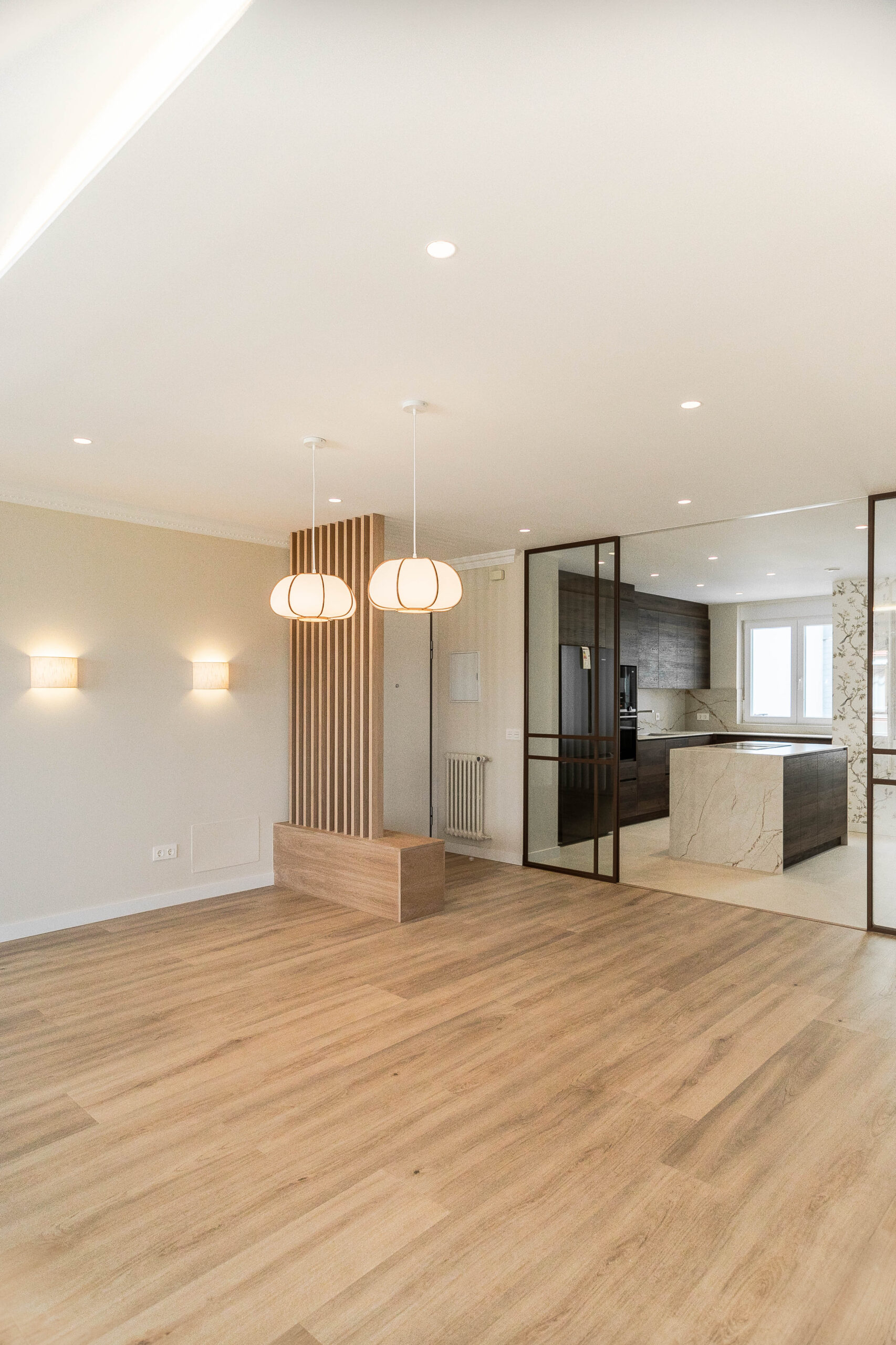 Se realizó una reconfiguración de la distribución interior, optimizando los espacios y generando ambientes más amplios, luminosos y conectados entre sí. La intervención incluyó la renovación completa de la vivienda, incorporando nuevos pavimentos que aportan continuidad y calidez a todas las estancias, se mantuvo el sistema de calefacción existente, llevando a cabo la reubicación y sustitución de radiadores, incorporando nuevas unidades para mejorar la distribución del calor y la eficiencia del sistema.
