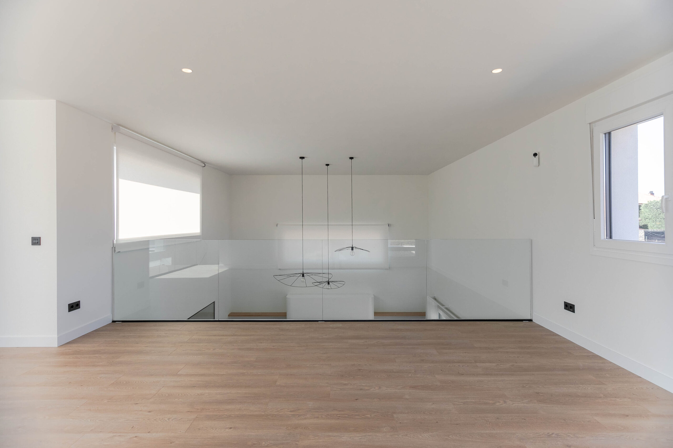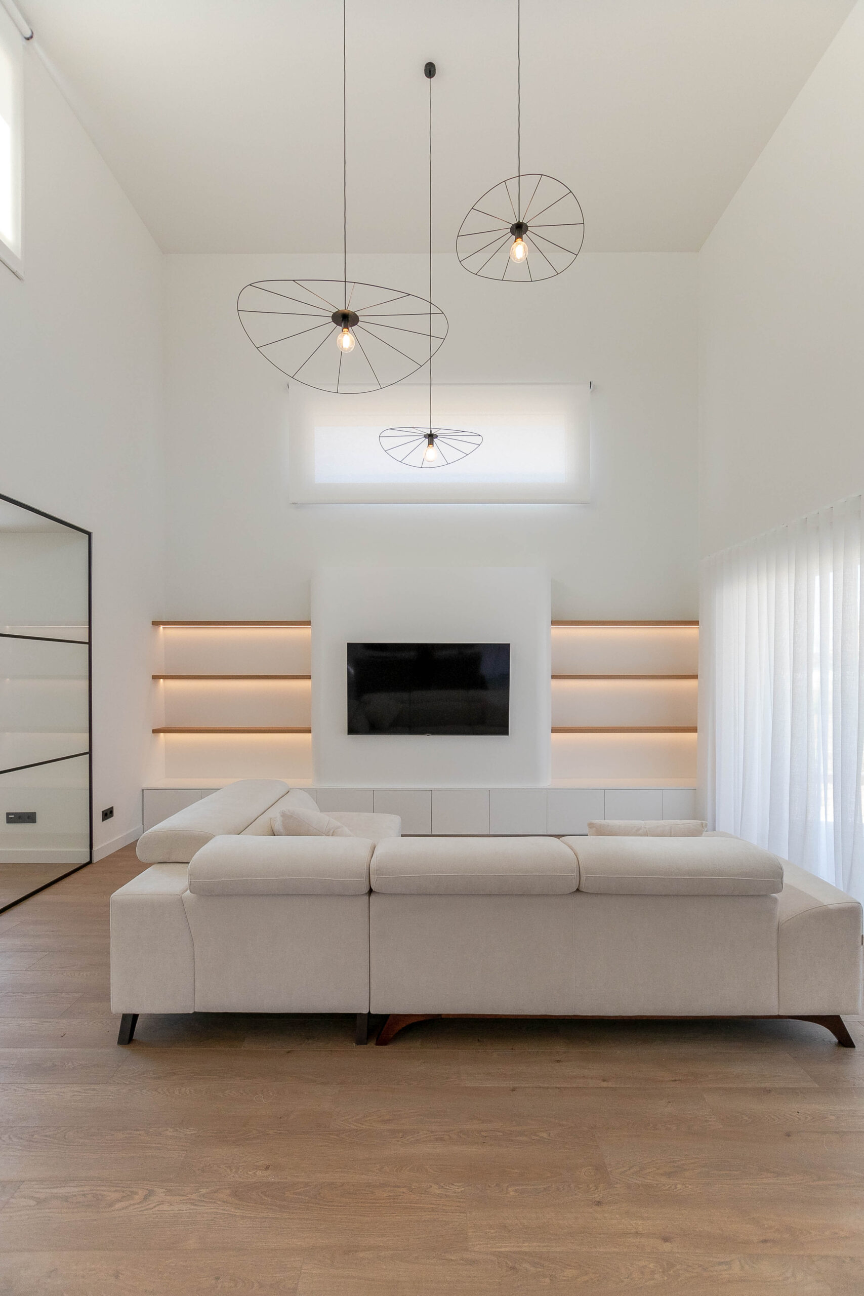 Ejecución de vivienda unifamiliar, diseñada con volúmenes limpios y amplios espacios interiores que favorecen la entrada de luz natural y la conexión entre estancias.